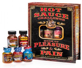 The set includes 12 sample-sized bottles of hot sauce, ranging from the mild Ass Kickin’ Bacon to the fiery Spontaneous Combustion. Try all varieties to complete the Hot Sauce 12-Step Challenge outlined on the inside packaging flap.